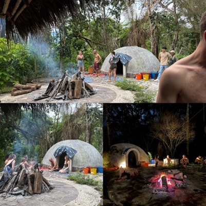 Meillä oli kunnia saada ensimmäisenä ryhmänä toteuttaa meksikolainen saunaseremonia. Kuvausryhmä oli paikalla ja muutenkin oli mukavan kihelmöivää jännitystä ilmassa. Temazcal on traditio, jota ollaan harjoitettu tuhansia vuosia Mesoamerikkalaisissa kulttuureissa. Temazcal eli meksikolainen sauna tai hikimaja on muinaisten meksikolaisten sairaanhoidossa käyttämä kylpemistapa. Nahuatlin kielellä Temazcal tarkoittaa kuumuuden taloa. Tila on kupolimainen ja pimeä ja siitä käytetään myös kohtumetaforaa. Rituaalissa korostetaan yhteyttä luontoon ja neljään elementtiin: maahan, veteen, tuleen ja ilmaan (neljä jumaluutta). Temazcal-seremoniaa johtaa yleensä temazcalero tai shamaani, tässä tilaisuudessa yksi meidän joogaopettajista, joka oli hyvin perehtynyt aiheeseen.