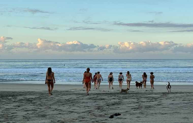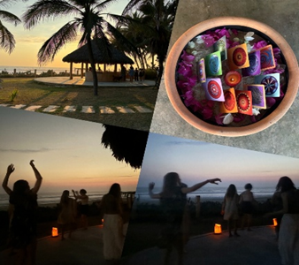 Eräänä lauantai-aamuna toteutimme meditaation jälkeen pyhän kylvyn (baño sagrado). Tämä on henkinen ja seremoniallinen rituaali, jonka tarkoituksena on tukea kehon ja mielen puhdistumista sekä uusiutumista. Tämä oli myös kiehtova yhteisöllinen kokemus, mitä kauneimmissa puitteissa. Tässä pyhänä vetenä toimi Tyyni Valtameri, jossa välillä saattoi nähdä valaan pyrstön häviävän mereen. Sama meri pauhasi meditatiivisesti yötä myöten ympärillämme.
